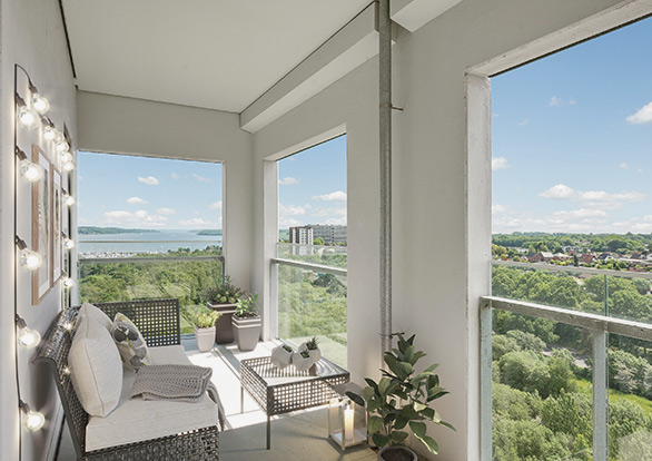 Havudsigt, endeløse trætoppe, byens røde tage. Fra Kolding Sky får man en unik udsigt over hav og by. Lejlighedernes overdækkede altaner giver beboerne et fantastisk uderum med læ for regn og vind. Her er god plads til at invitere gæster til et misundelsesværdigt kig over smukke Kolding