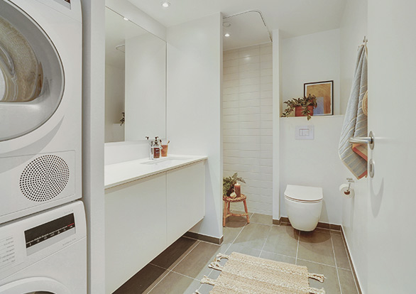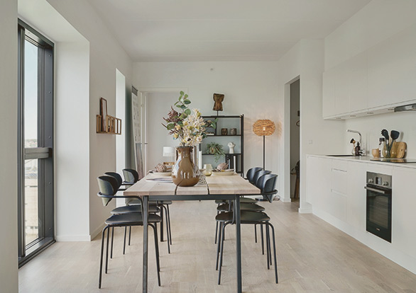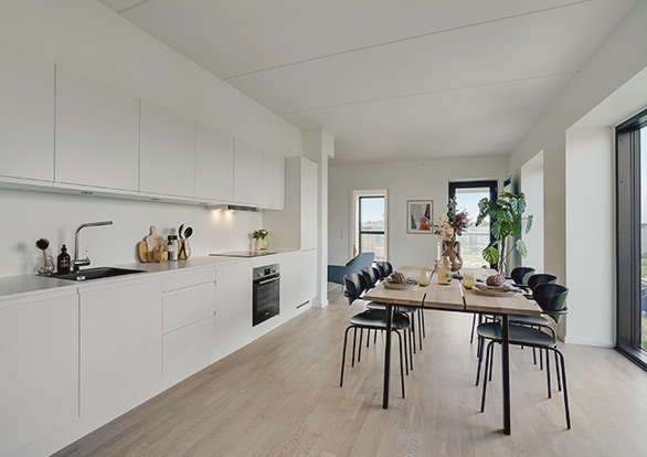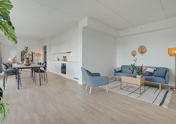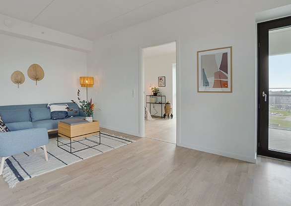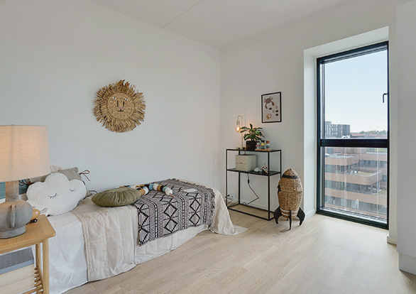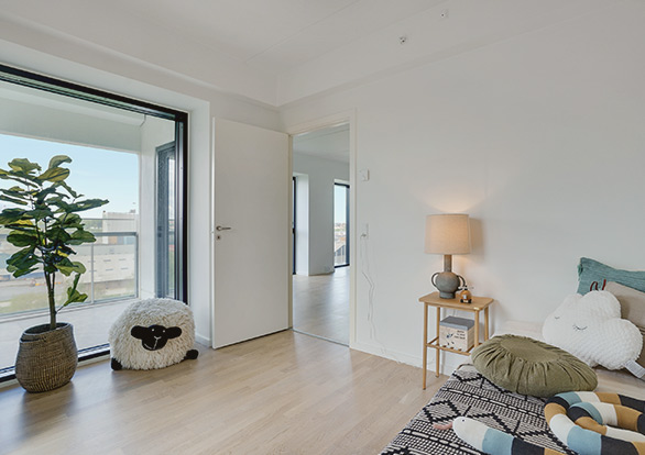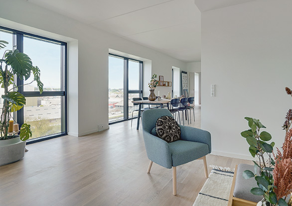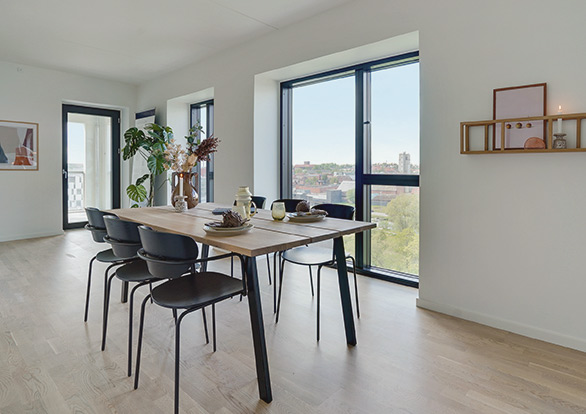Kolding Sky byder også på rummelige lejligheder med god plads til det aktive familieliv. Åbne køkken-alrum, store badeværelser og lyse værelser. Forestil dig at bo over hav og by med hurtig adgang til Koldings fornøjelser.